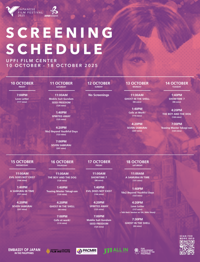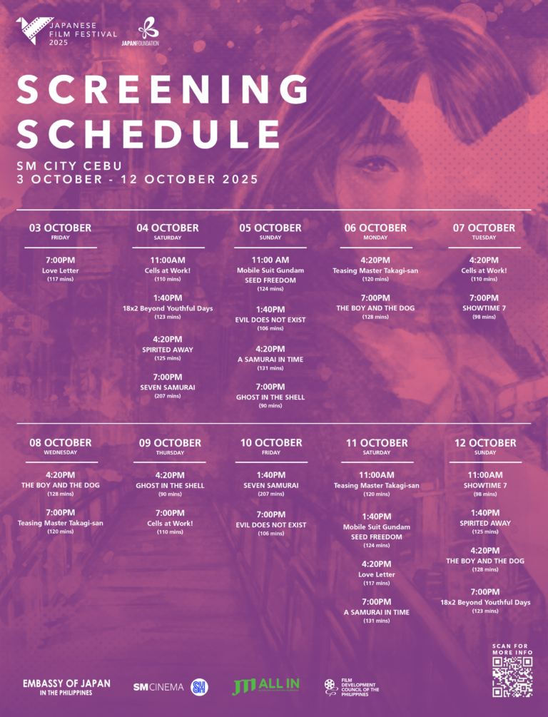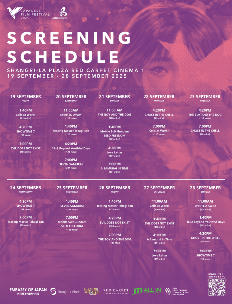 JFF 2025 is screening at Shangri-La Plaza Red Carpet Cinema, UPFI Film Center, SM City Baguio, SM City Cebu, SM Lanang Premier, and SM City Clark until October 26. Grab a friend and visit any of the six locations to experience Japanese cinema for free.
