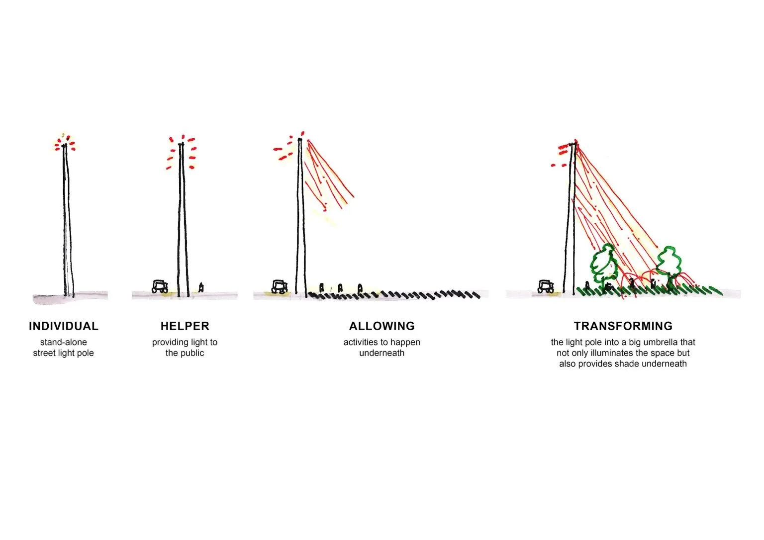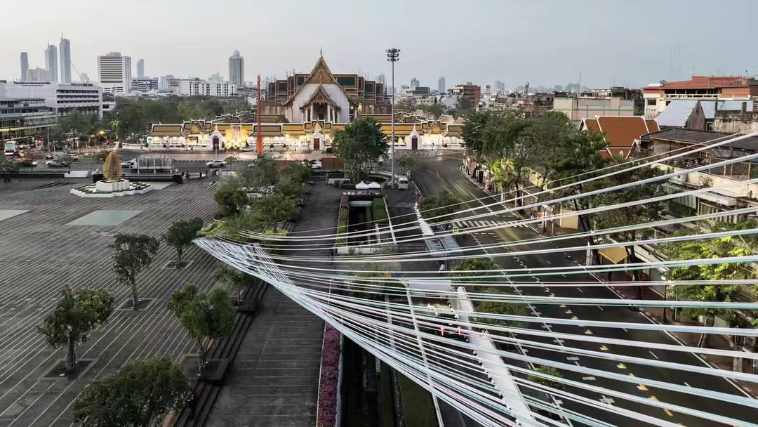 The zero-waste aspect comes into play with the minimal materials they used to set up the pavilion. The foundations made use of existing streetlights along the plaza for the structural framework. From there, the pavilion was designed to look like a rainbow-like installation, using multiple colors that play with light and shadow for a dynamic atmosphere. At night, the pavilion becomes a beacon of light that extends into the square, with the streetlights reflected on the strips of fabric, amplifying it within the area. All in all, the design was created to enhance urban infrastructure aesthetically and incorporates shading, ventilation, and arcade-like spatial conditions perfect for Thailand’s tropical climate.